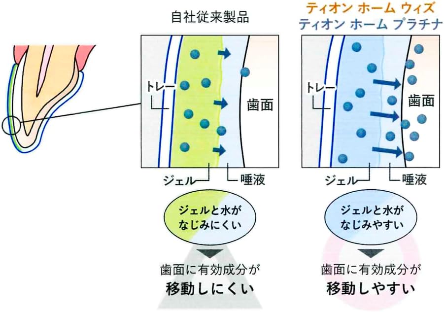 ティオン ホーム プラチナ同様、ジェルが水となじみやすく、有効成分が効率よく歯面へ浸透し、高いホワイトニング効果を発揮します。